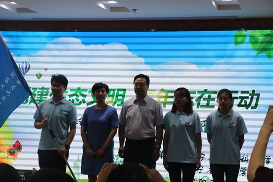 随后,张国徽、张云秘书长为志愿者代表授队旗、佩戴队徽;学生代表陈莹莹上台讲话,表明自愿投身环保事业的决心;志愿者代表宋明超带领全体与会志愿者宣誓。