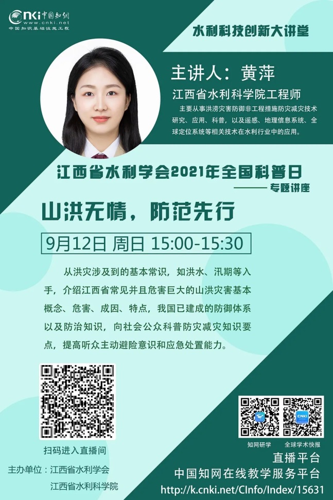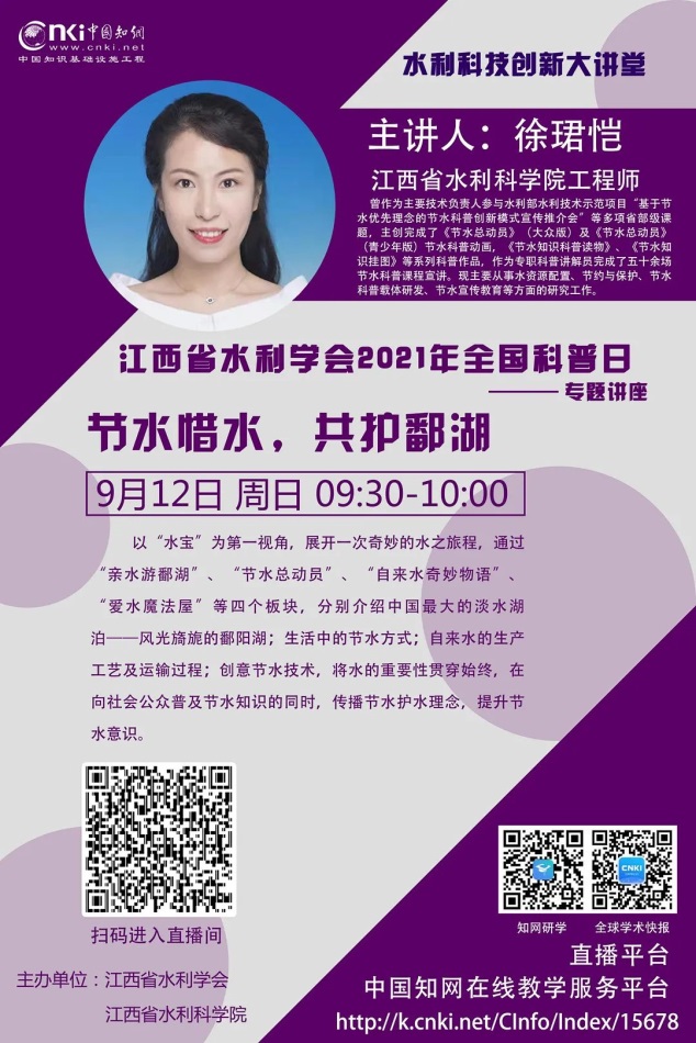 此外,利用我会在中国知网在线直播品牌平台——水利科技大讲堂,开展云上科普讲座,分别以“节水惜水共护鄱湖”与“山洪无情防范先行”为题向全省中小学生讲授了两堂精彩的水利科普课。