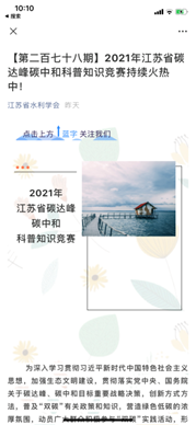 河海大学科协、省水利学会在2021年全国科普日期间,共同举办了“水美家乡”微信科普大赛。活动在各类平台广泛发布,并设立最佳作品奖。活动鼓励因受疫情影响暂不能到校上课的同学,用相机、手机镜头以独特的视角,有创意的艺术手法,拍下家乡美丽的水,通过微信分享给好友,上传到微信公众号进行展示宣传并参与最佳作品奖的投票,据不完全按统计,参与投票的人数达3022人次。